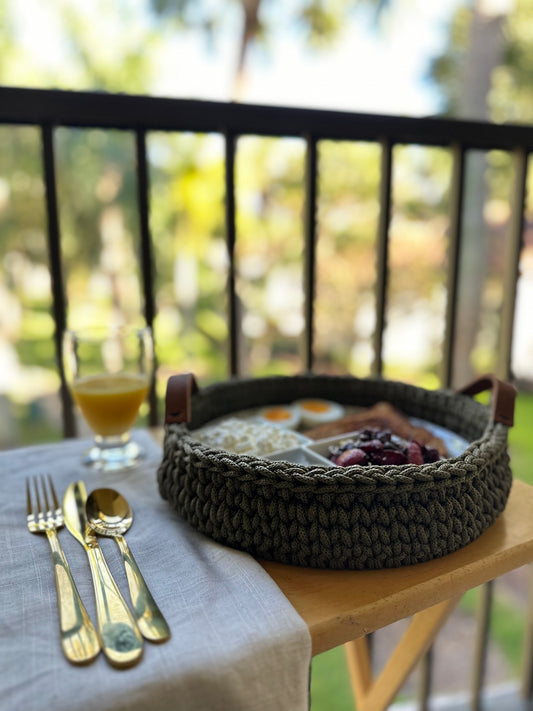 Handmade Crochet Basket with Wood base & Leather handles