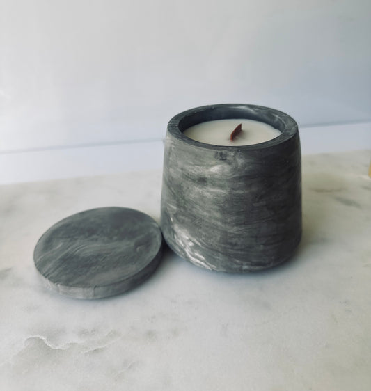 GRAY Marble • 6.5oz wood wick aesthetic ceramic pot with lid. Soy wax candle with notes of Vanilla & Citrus