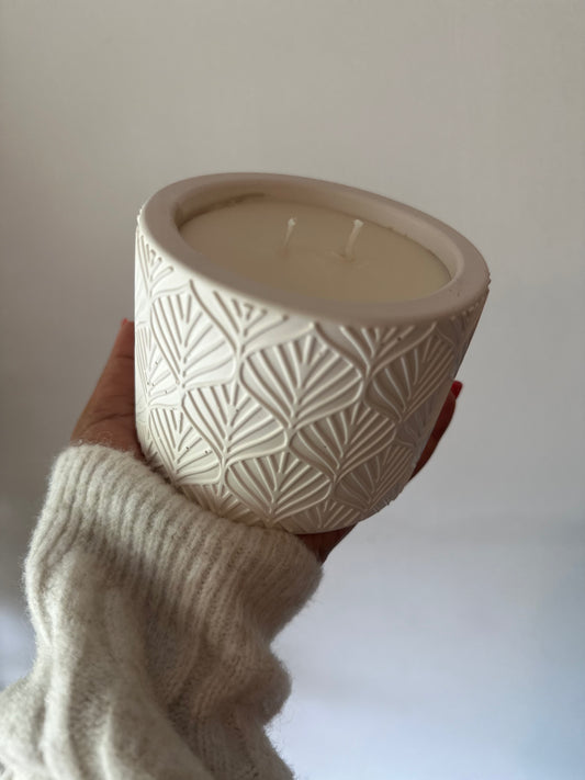 Decorative White ceramic pattern candle jar.